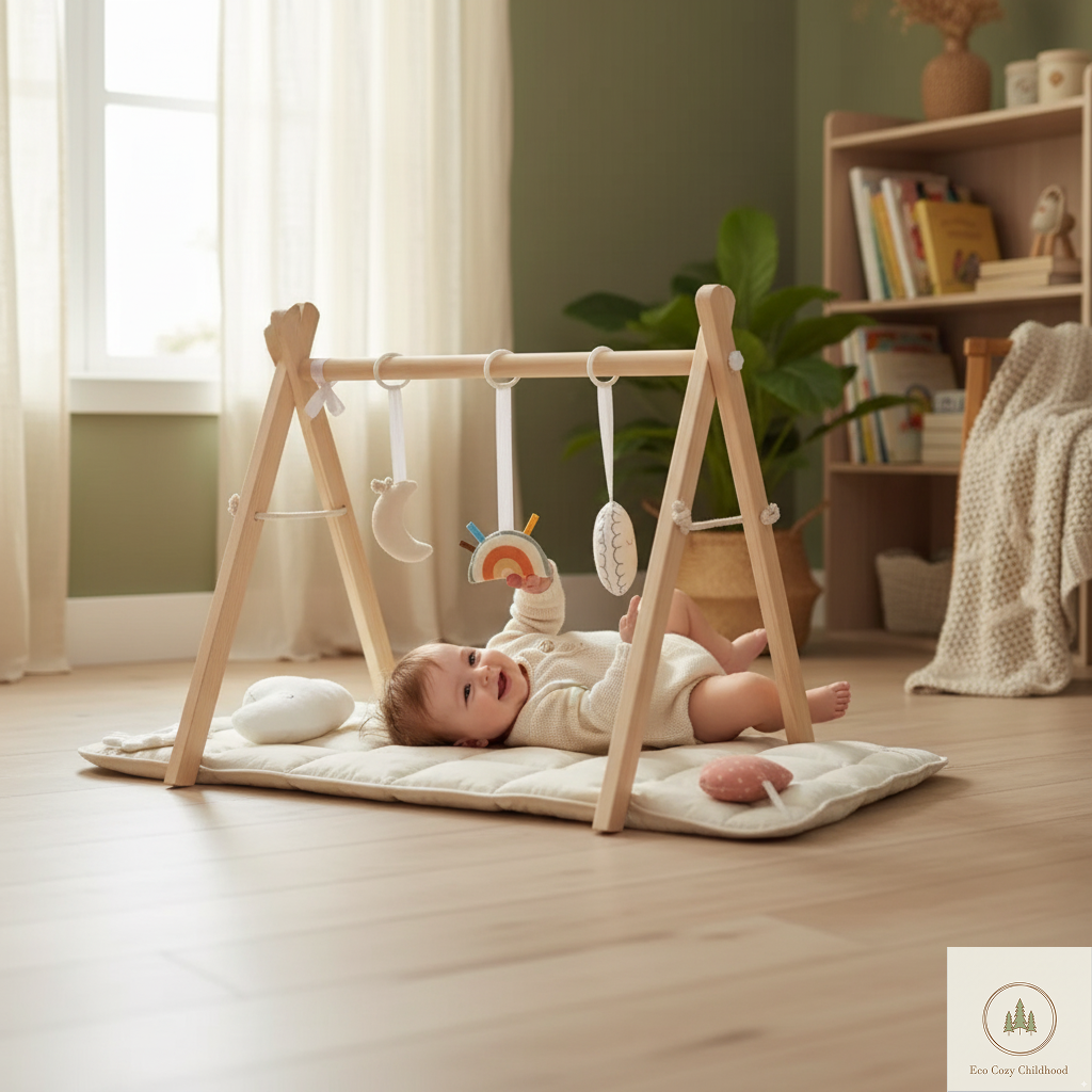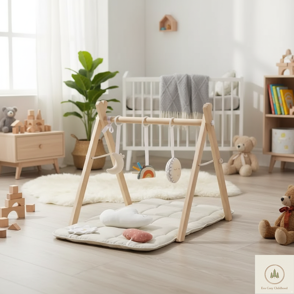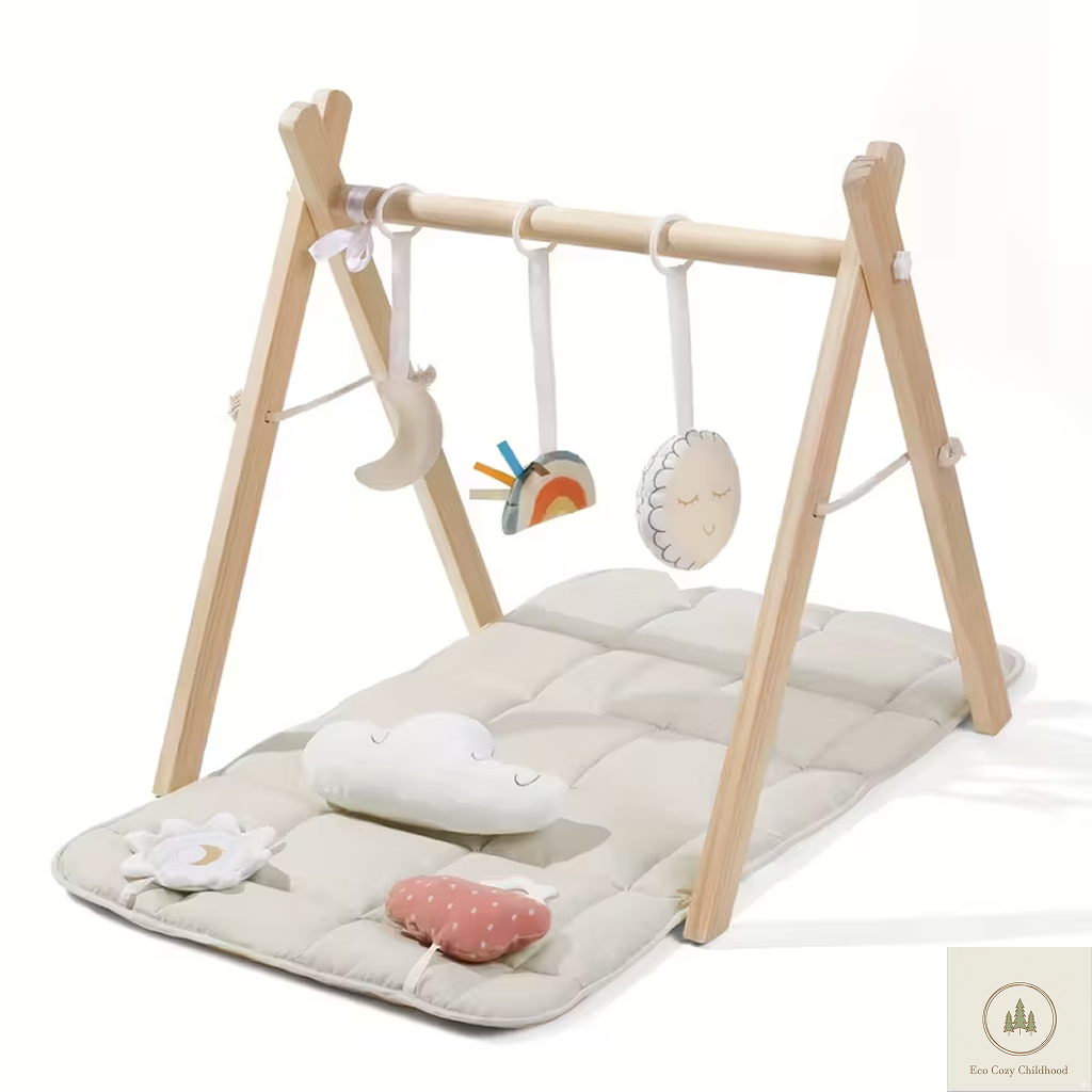Eco-Friendly Wooden Baby Play Gym with 3 Hanging Toys – Foldable Developmental Activity Center for Newborns